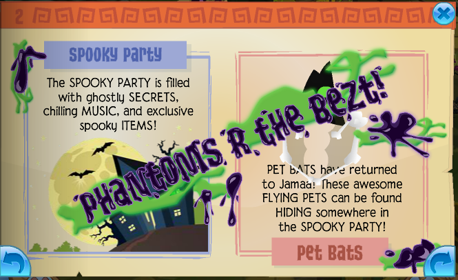 The Spooky Party has returned to Jamaa once again,so be sure to visit it today to get your spooky items and accessories and awesome music! The Pet Bats have also returned to Jamaa they are hidden somewhere in the Spooky Party!
