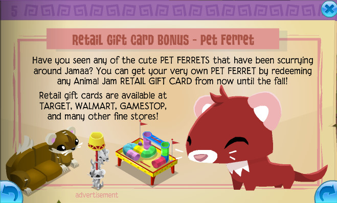 You can get your very own Ferret whenever you purchase an Animal Jam retail gift card from one of your local Target,Walmart or Gamestop stores. This is only available until Fall. Moving onto page 6..