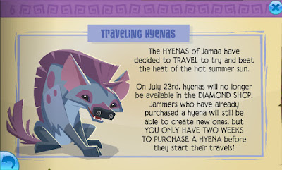 Unfortunately on July 23rd Hyenas will no longer be available in the Diamond Store as they are due to travel. You only have 2weeks to purchase your very own Hyena. There is a brand new daily explorer post about some Jammer Snaps. Click